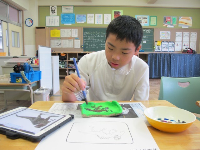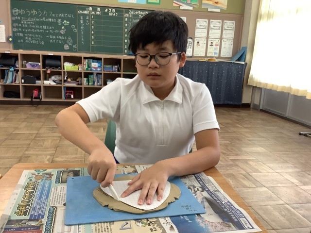 あしあと展に向けて、オーブン粘土を使ってお皿作りに取り組んでいます。粘土の感触を楽しみながら平らにのばし、成形しました。一度素焼きをしたものに絵の具での着色と乾燥を繰り返し、「ぼくの好きなもの」のつまったお皿に仕上げることができました。