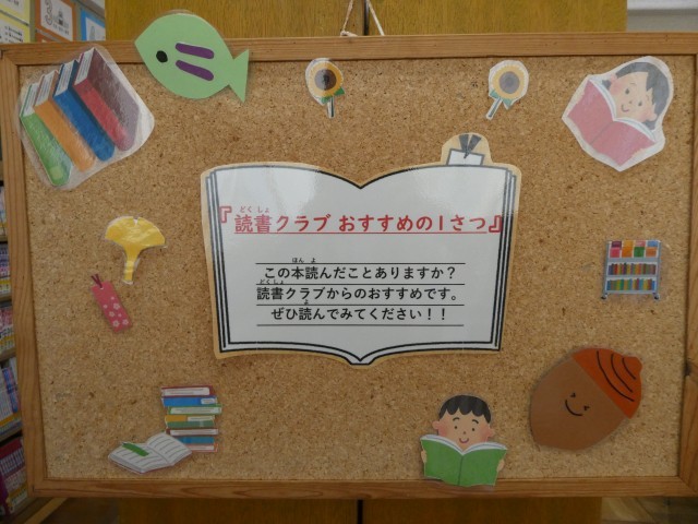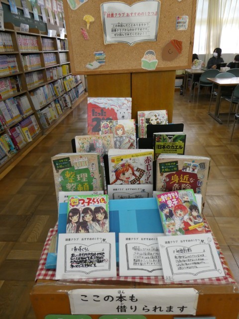 図書室の机の前のスペースには、前回のクラブ活動で作った本の紹介カードと本がセットで置かれています。