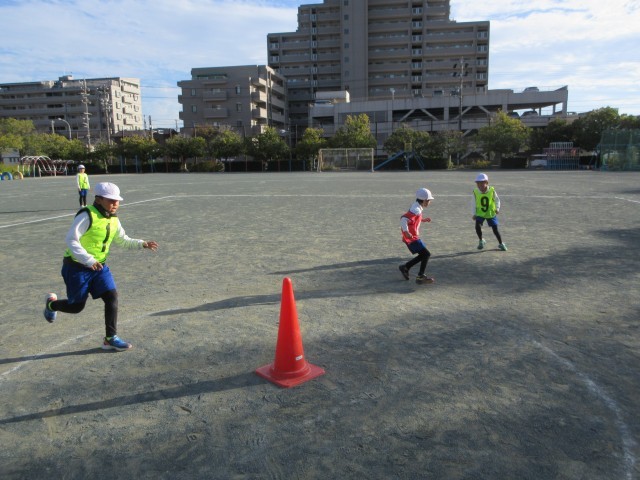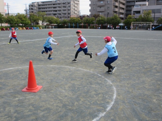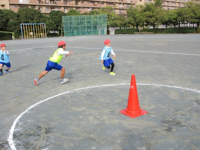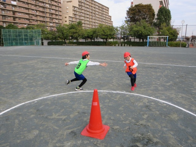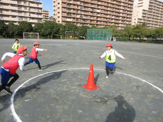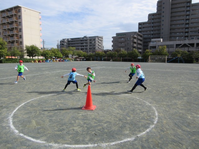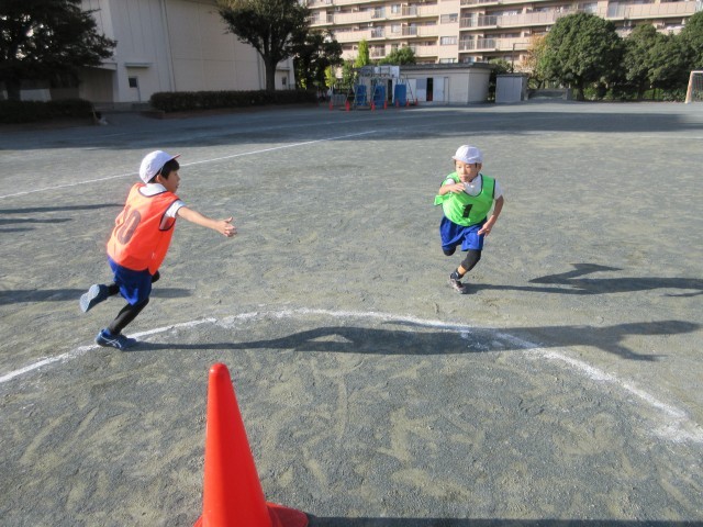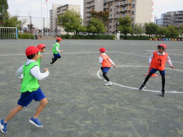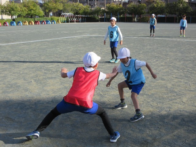 体育の授業でスポーツおにごっこを行っています。「みんなの力でお宝をとるためにはどうしたらよいか」を課題にチームで協力しながら取り組んでいます。お宝をとらなくても相手を引き付けるおとり役となってチームのために走ったり、自分の考えを作戦板を使って仲間に伝えたり、一人一人チームでの役割をもって取り組む姿が見られます。どうしたらお宝をとることができるのか、今後もみんなで考えていきましょう。