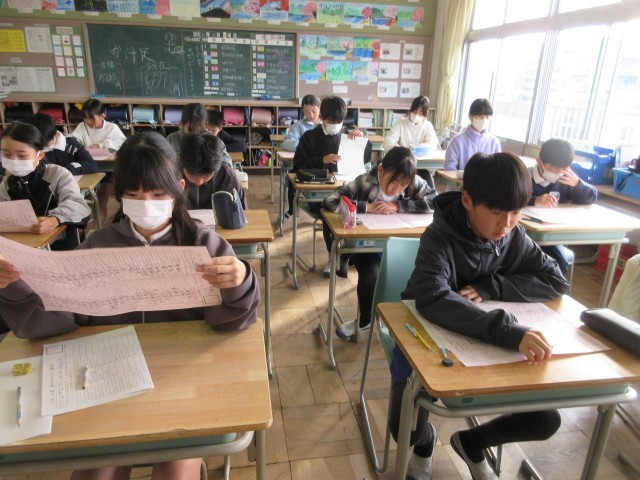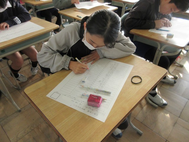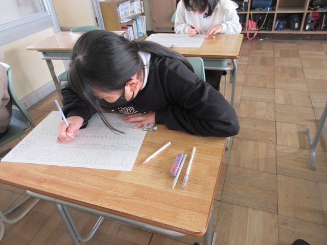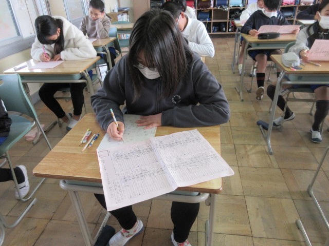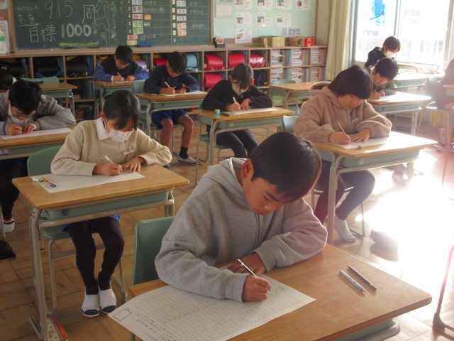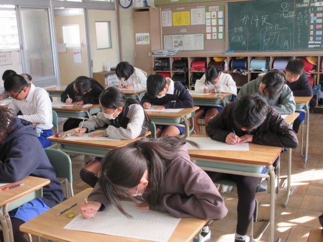 2学期に予定していた新出漢字の学習が終わったので、漢字力テストを行いました。開始ぎりぎりまで練習したり注意点を確認したりして臨みました。きちんと整った文字を書こうという姿勢が身についてきて、外部講師の方にお礼の手紙を書いたときに「全員がしっかりした文字を書けることに驚きました。」とお褒めの言葉をいただきました。いつもがんばって練習していることの成果がこういうところで表れてくるのだと思っています。