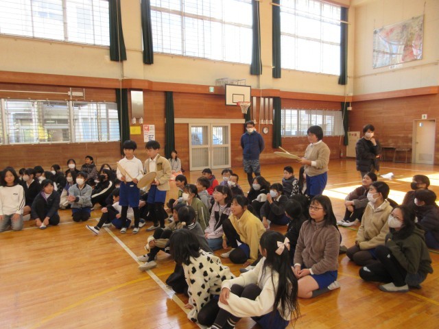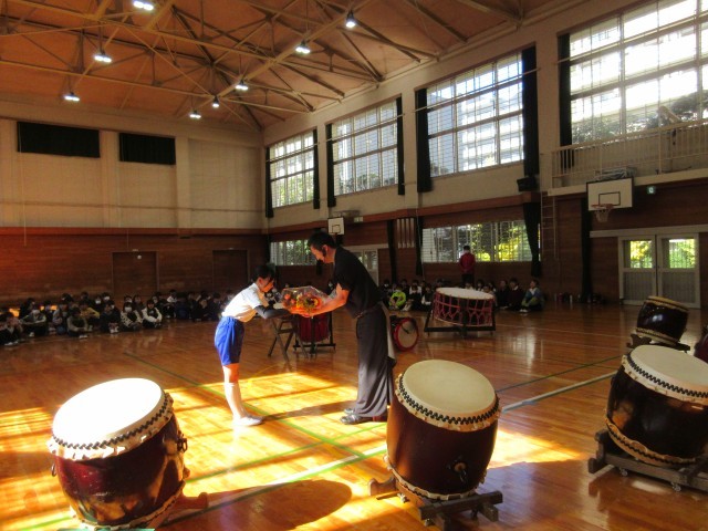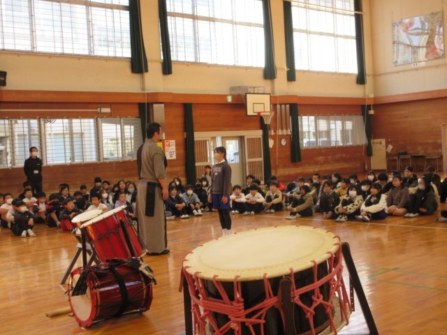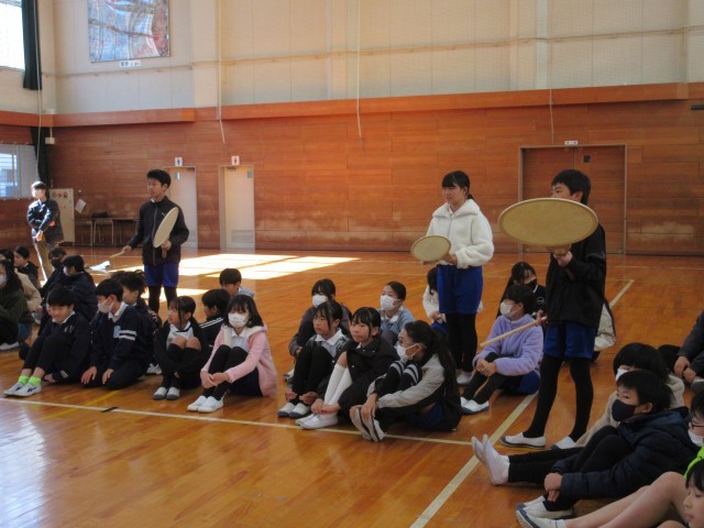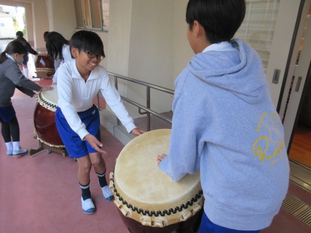 先生はうちわ太鼓というのも持って来てくださっていて、希望者でじゃんけんに勝った子が貸していただきました。太鼓を持つことができなかった子も、ひざや床でリズムを打ち、その基本リズムに合わせて先生が難しいリズムをたたいてくださってセッションしました。和太鼓クラブの人たちの演奏にもきっと生きてくると思います。今回は6年生の学級委員、企画委員が司会、進行、片付けのお手伝いをしました。よい経験になりましたね。