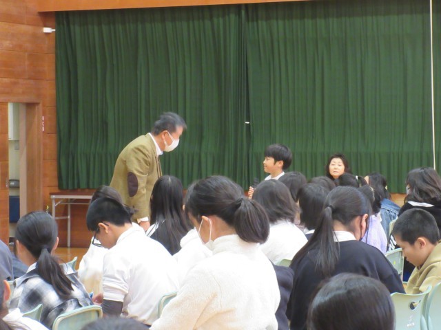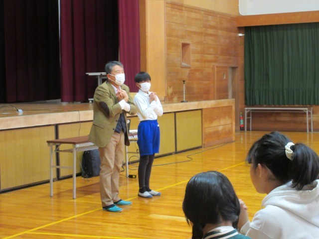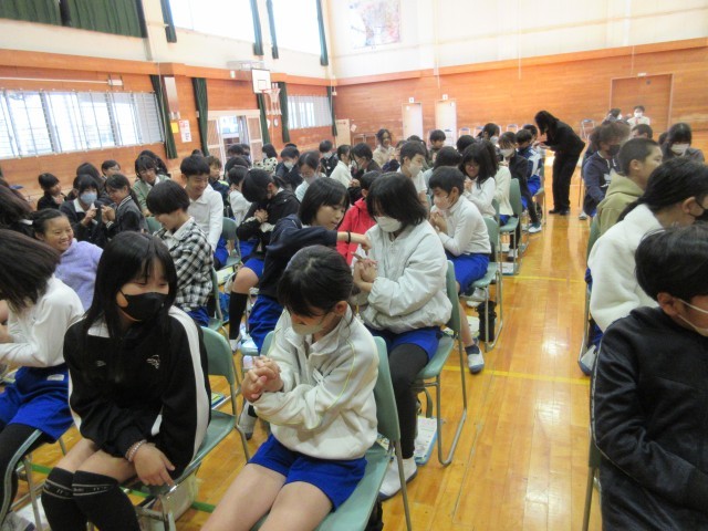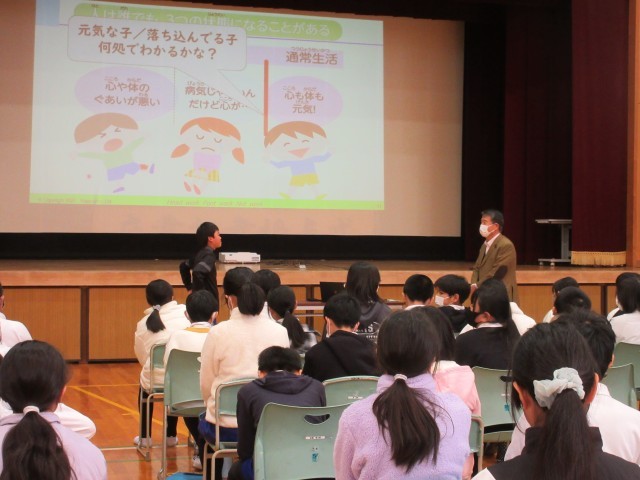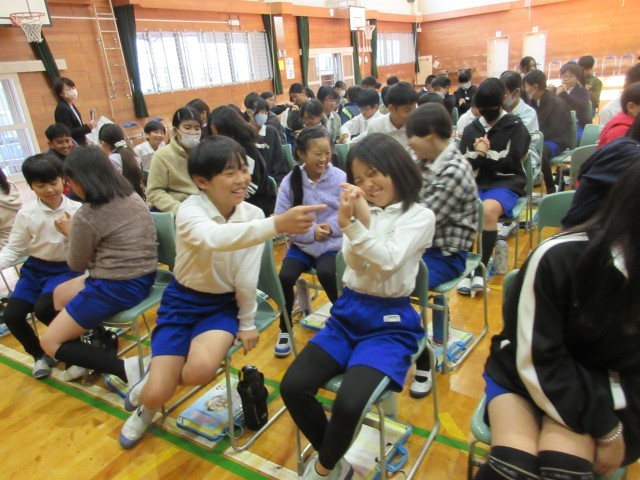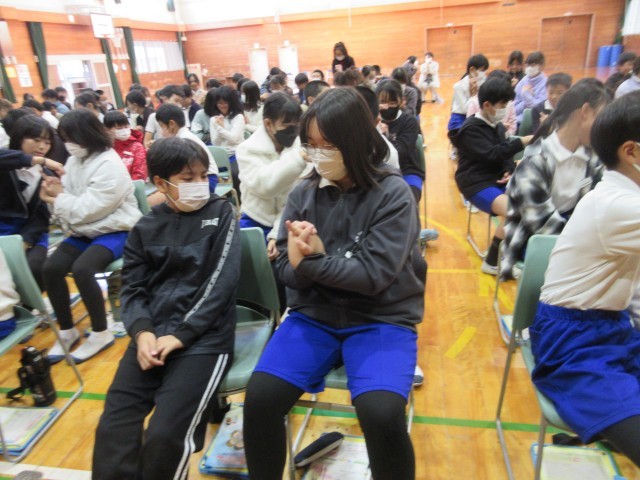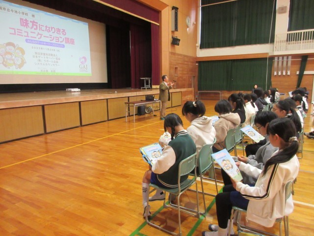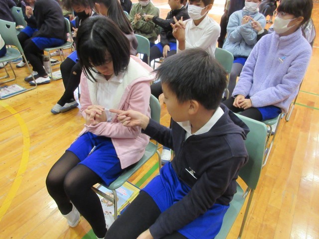 講師の先生をお招きして「味方になりきるコミュニケーション講座」が行われました。相手の心の状態によっては「がんばれ」という声かけが適切ではないということを知りました。手を交差してから組んで、指された指を立たせるという「手のワーク」では、思い通りにならないときの気持ちを体験しました。日常生活の中では、名前とあいさつをセットにして話すOKメッセージを、様子が気になる人にはアイメッセージを、落ち込んでいる人には「共感・感謝・約束」のハートメッセージを贈るとよいことも学びました。これからのコミュニケーションに生かしていくことで、みんなが生きやすい学校生活を送れるようになると思います。