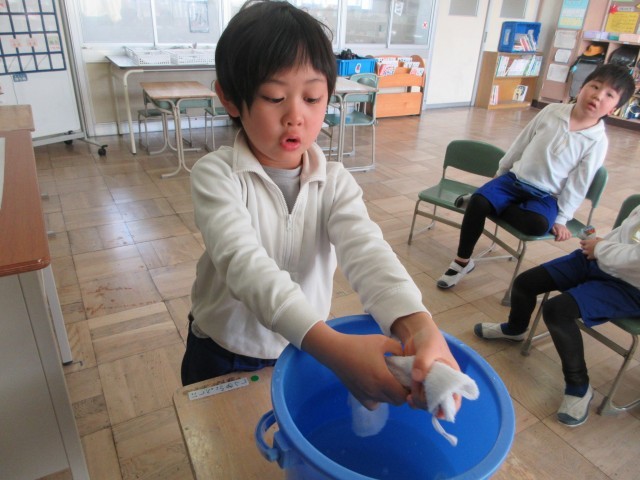 「手でかにを作って、縦にずらしてしぼる。」をかけ声に雑巾を絞りました。