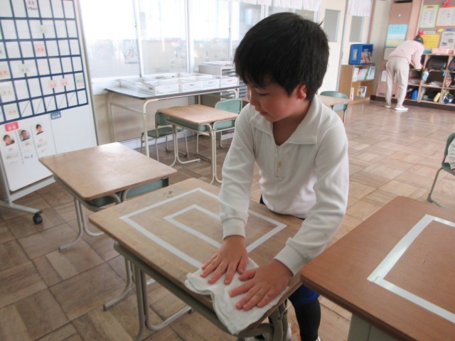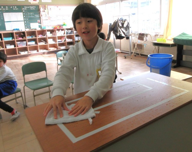 また、机に貼ったビニールテープに沿って拭くことで、隅々まで拭く練習をしました。