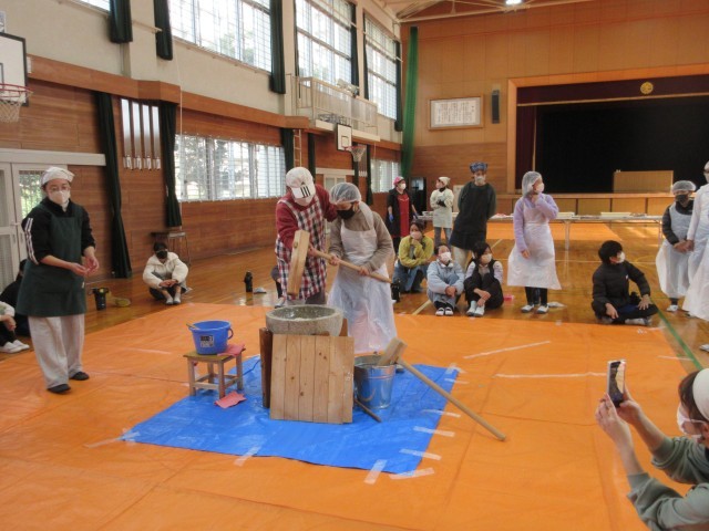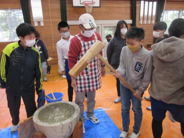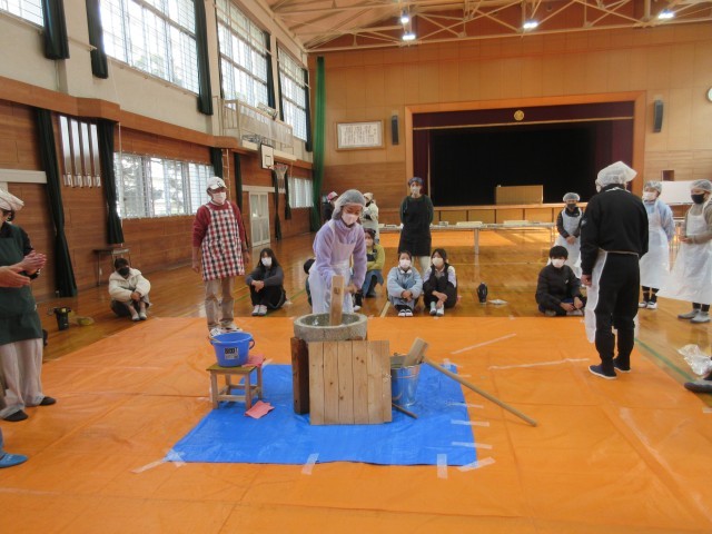 6年生にとって最後のもちつきの会でした。まず、ボランティアの方にある程度ついていただき、その後代表の子が交代でつきました。つき終わった後、杵をさわらせてもらった子もいます。結構な重さでしたね。