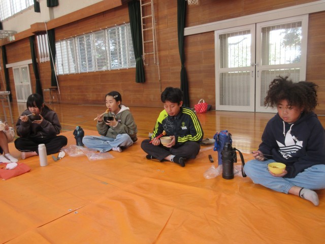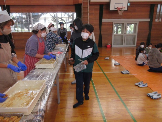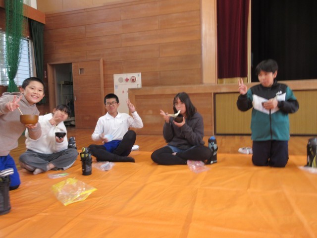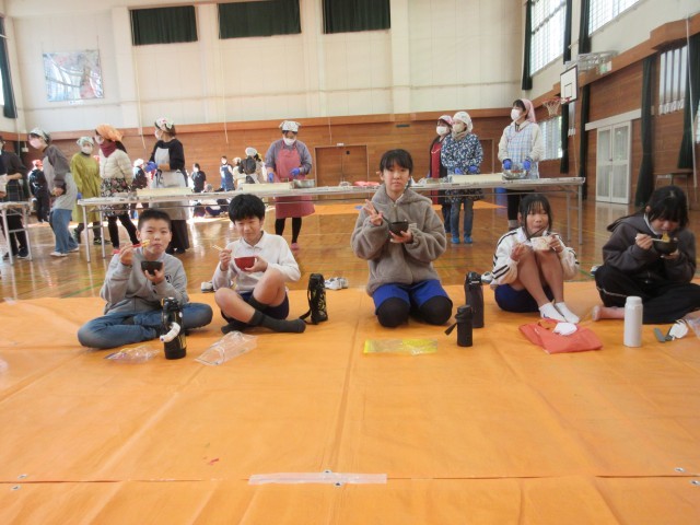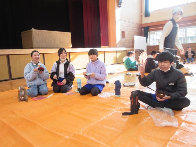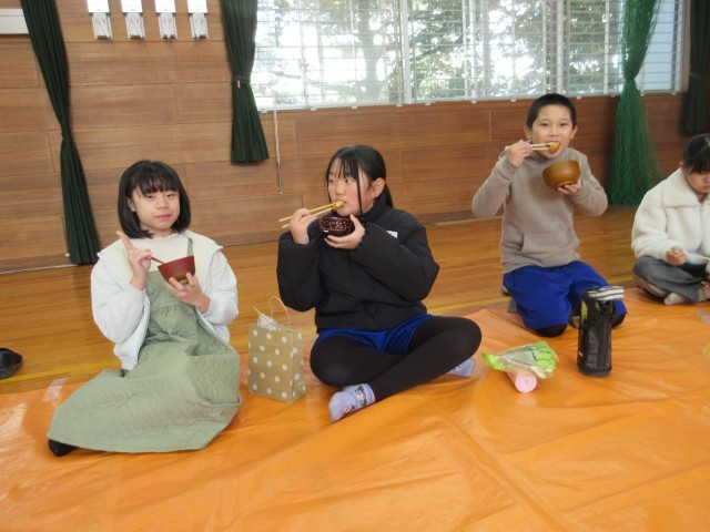 ボランティアさんから「きなこ」「大根おろし」「みたらしあん」のおもちを受け取り、「いただきます」の後、味わいました。