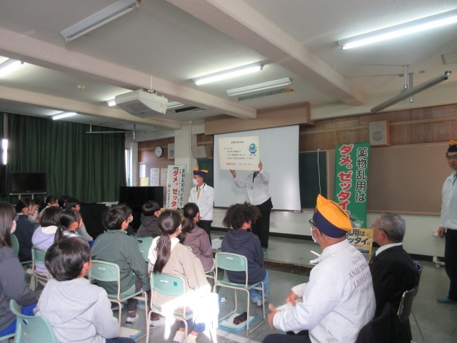 保健の授業で、たばこ、酒、薬物乱用の害について学びました。風邪薬のような一般的なものでも、使い方や量が適切でないと心身に害があることも知りました。今日は安城南ライオンズクラブの方と、薬物乱用を体験した方からお話を聞き、「ダメ!絶対!」のポーズとともに、例え誘われたとしても関わらないようにしようという気持ちをもちました。