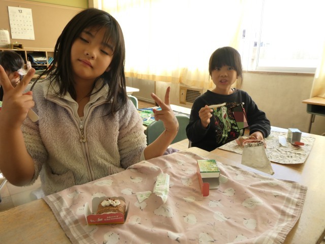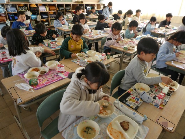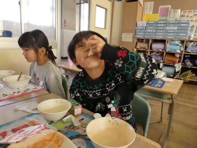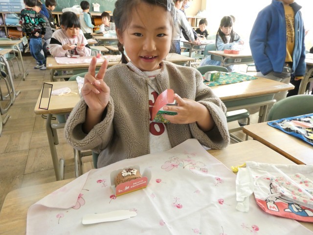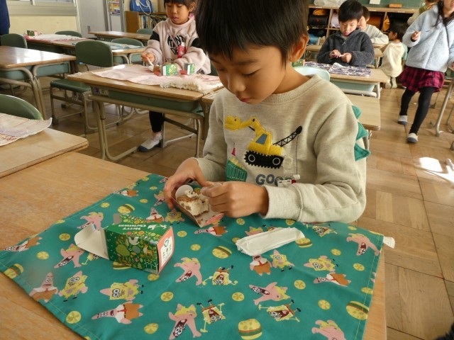 1年1組では、ツリーの形のハンバーグやショコラケーキをおいしそうに頬張る姿が見られました。