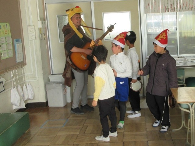 みんな、サンタさんからタンブリンや鈴、かぶり物をもらって、ギターに合わせて「あわてんぼうのサンタクロースを歌いました。