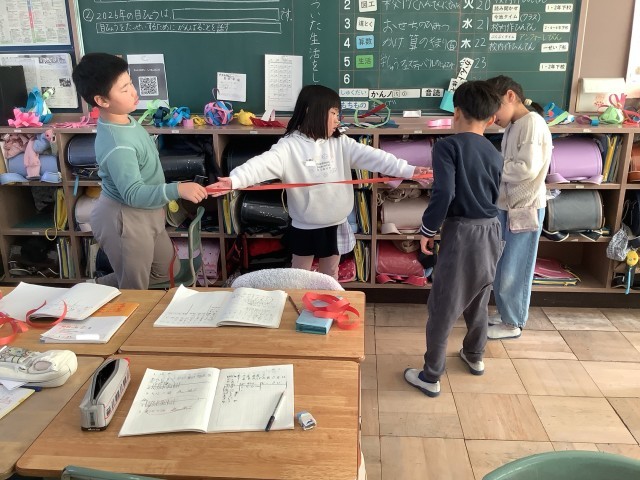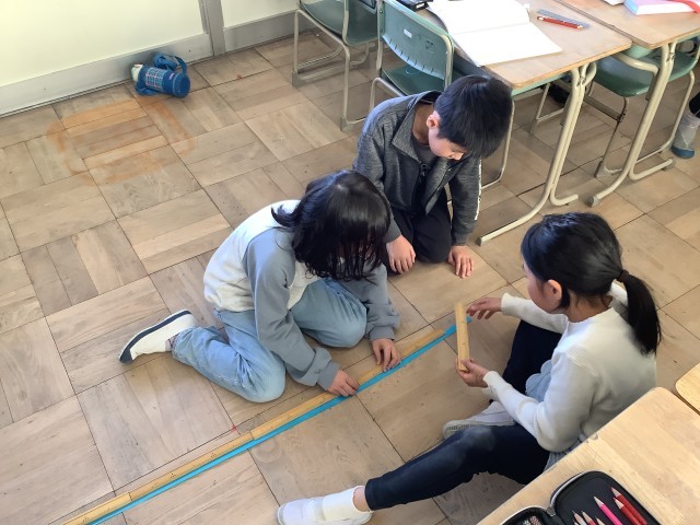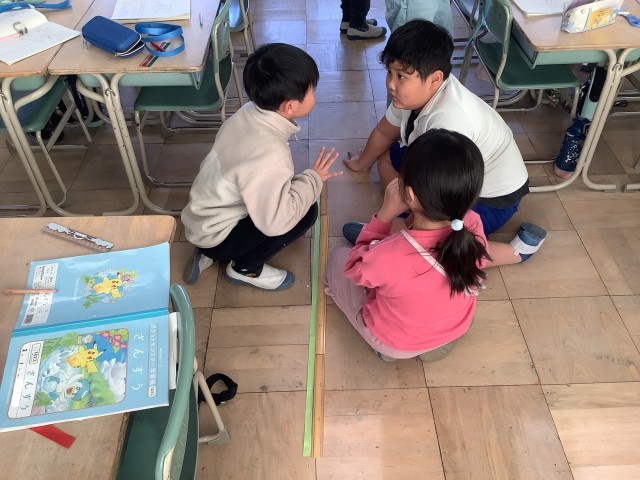 今日の算数では、両手を広げた長さをはかりました。友達と協力して、紙テープを切り、長さを予想してから、ものさしを使って調べました。「ここで30cmだから、次は・・・」と友達と確認しながら調べていました。長さの別の表し方はあるのかな?