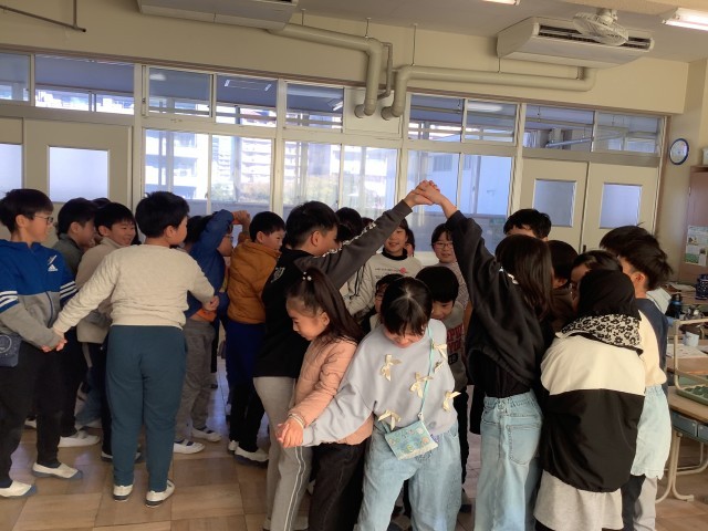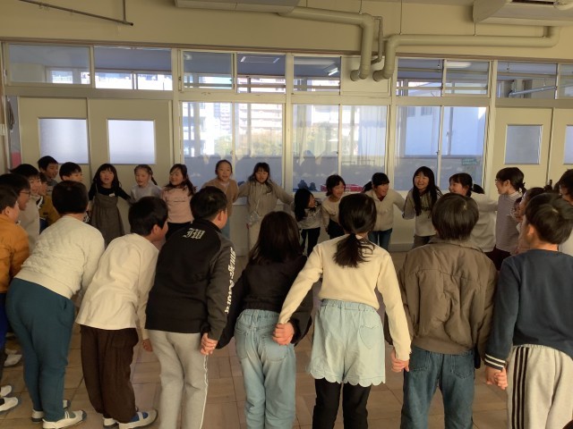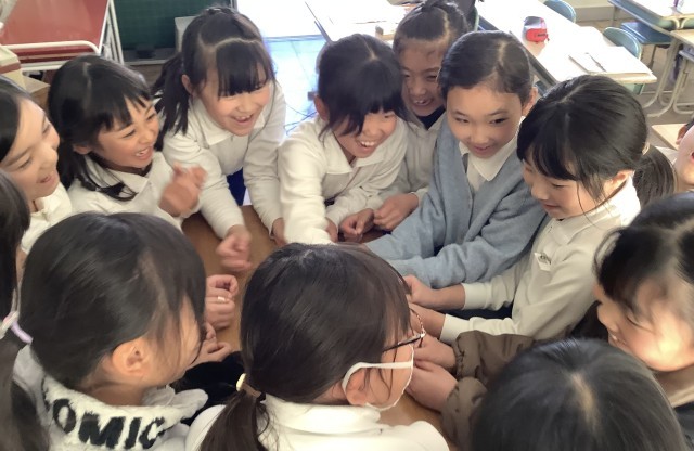 音楽の授業では、わらべうた「ずいずいずっころばし」「なべなべそこぬけ」を歌いながら友達と遊びました。2~3人から始まり、「もっと人数を増やそう」と自分たちで声をかけ合って、大人数で遊びを楽しむ姿がすてきでした。