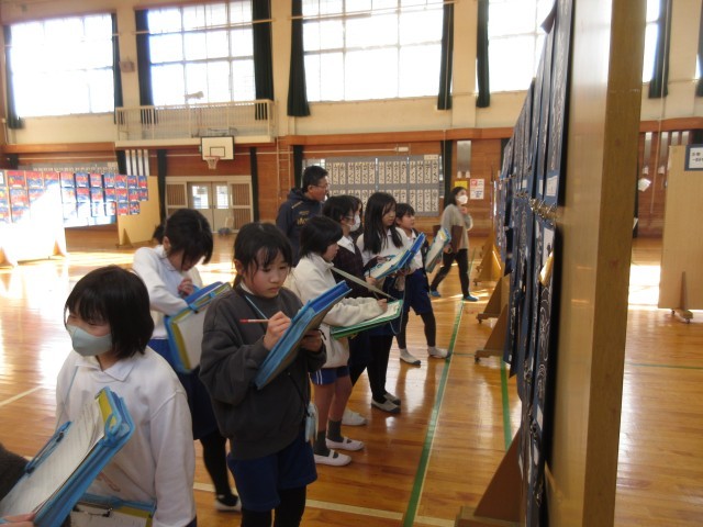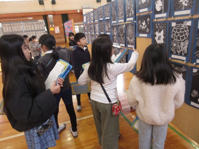 作品展の鑑賞をしました。金賞の作品や来年の参考に5年生の作品などを熱心に見ました。素敵な作品がたくさんありました。