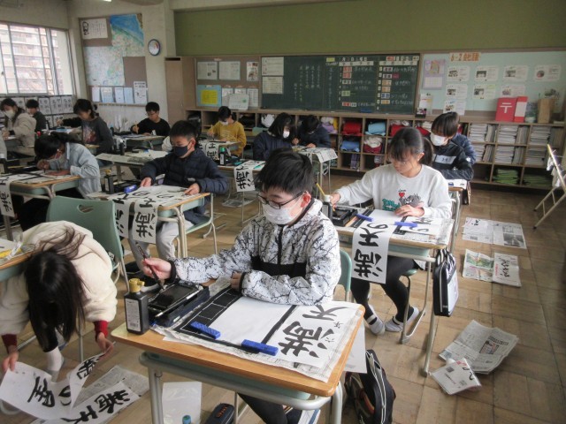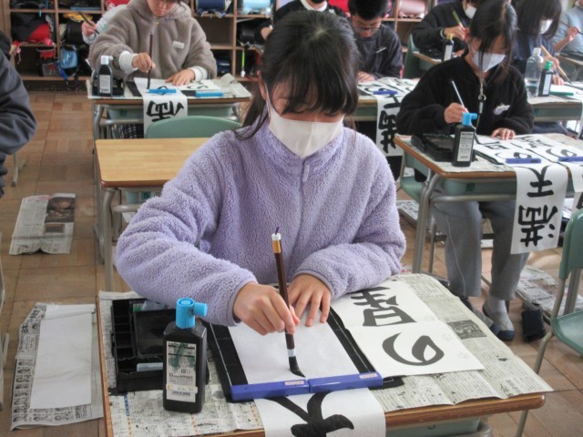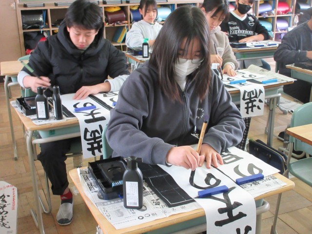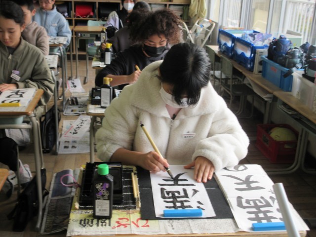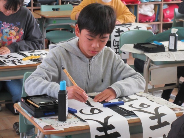 最後の書き初め会、一画ずつ、名前までていねいに取り組みました。