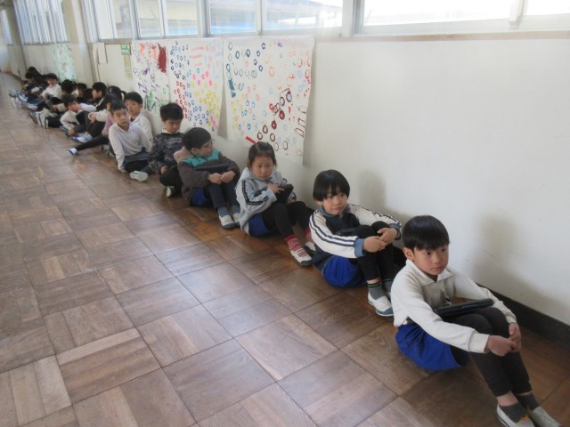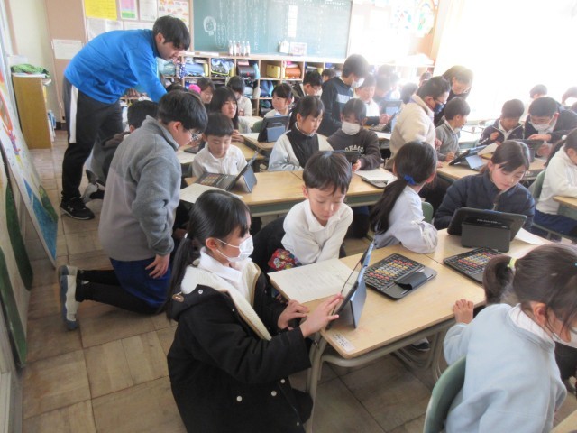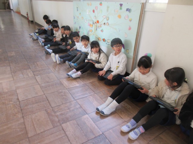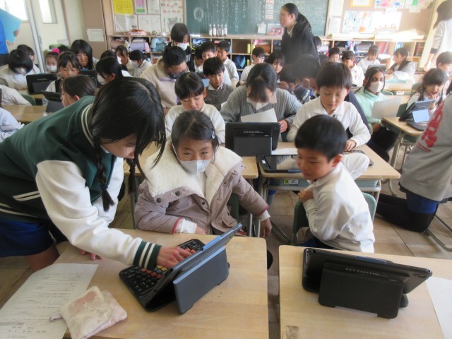 1年生は、6年生のペアのお兄さん、お姉さんに新しいタブレットの使い方を教えてもらったり、