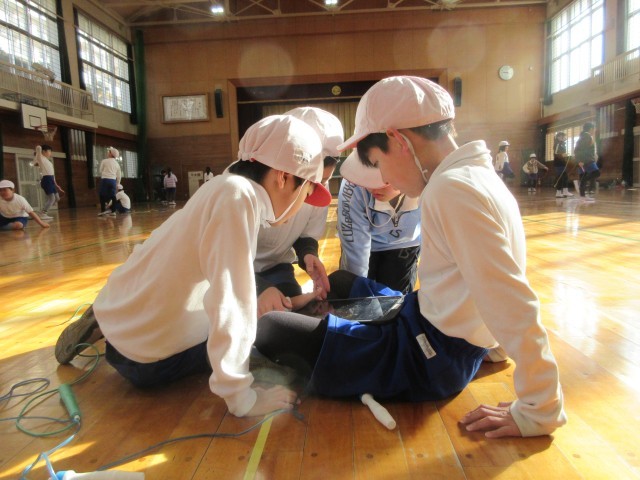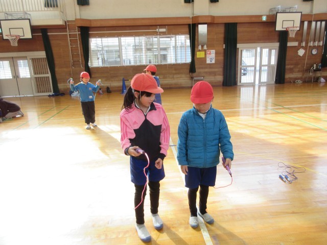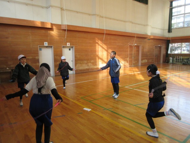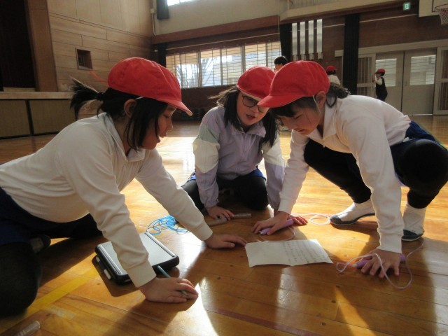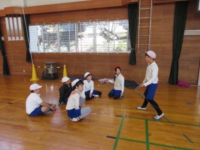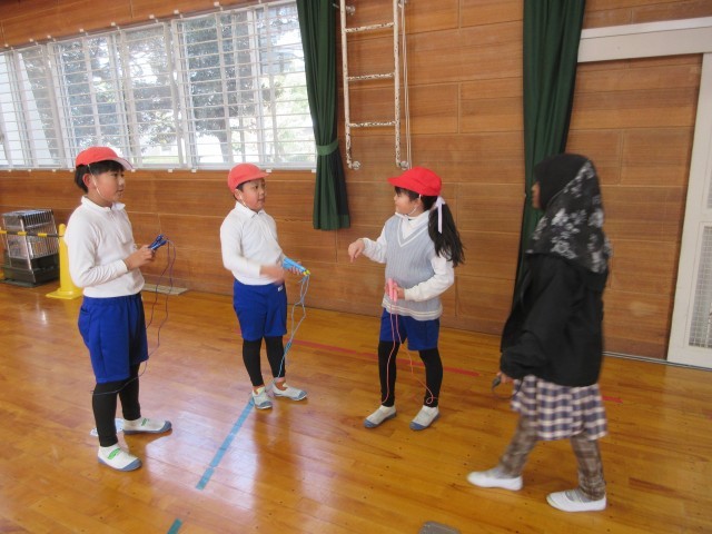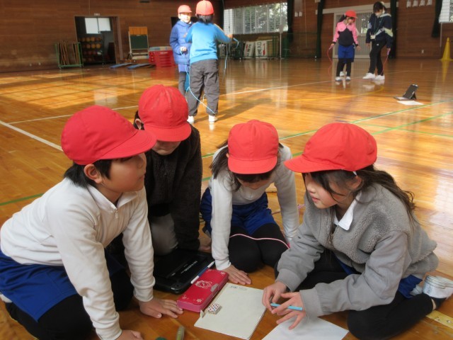 なわとびの個人技を練習し、練習した個人技を組み合わせながら、グループでなわとびダンスを考えています。音楽に合わせてどんな技を入れようか、どんなフォーメーションで技をやろうかなど、グループで話し合い、協力しながら取り組んでいます。授業時間だけではなく、放課にも自主的にたくさん練習に取り組んでいます。発表会がとても楽しみです。