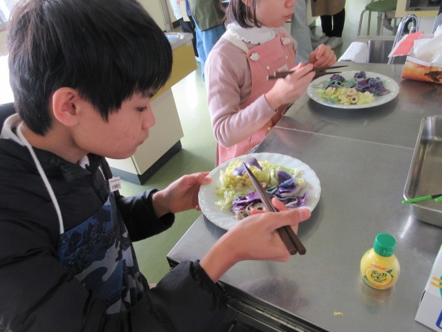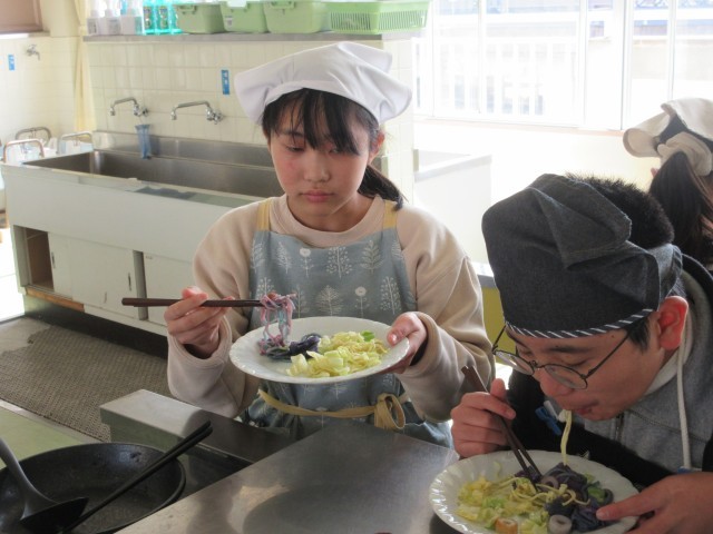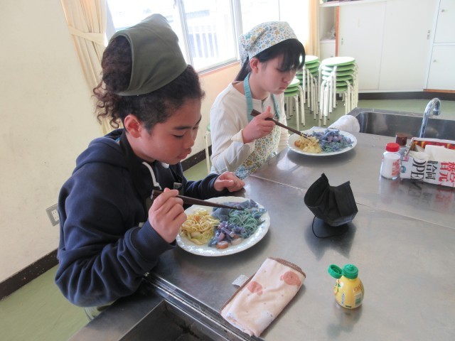 理科で水溶液の性質について調べています。まだこれから学習することなのですが、液性を調べてなかま分けをするという内容があります。今日はそれに関連する調理実習を行いました。普通のキャベツで作る焼きそばと、紫キャベツで作った焼きそばを比較しました。色の変化を見るため、ソースはかけずに塩こしょうで味付けしました。普通のキャベツでは黄色かった麺の色が、紫キャベツで作ると濃い青緑に変わりました。紫キャベツと一緒にお皿に載っていると何とも食欲のわかない取り合わせです。食べてみると結構おいしいという感想でしたが。食卓でのいろどり、見た目の大切さも感じました。希望者は青緑になった麺にレモン汁をかけてみました。今度はピンクに変色しました。今日、目の前で起きた現象の理由を、今後の理科の学習で探っていきます。