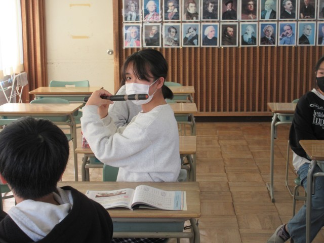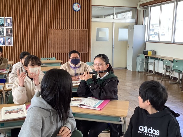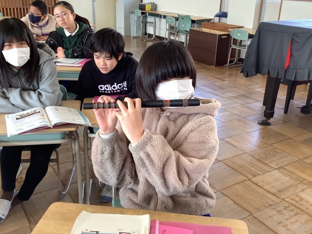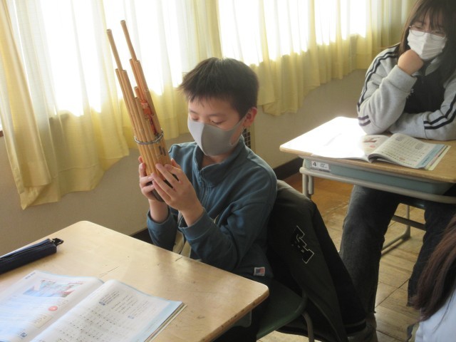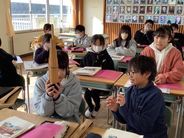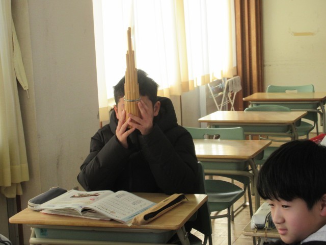 平安時代、貴族のものであった雅楽は、越天楽今様のように歌詞がついて民衆の文化にもなっていきました。使われる楽器のうち、篳篥、竜笛、笙が準備室にありました。せっかくなので、順番に楽器を構えてみました。