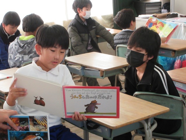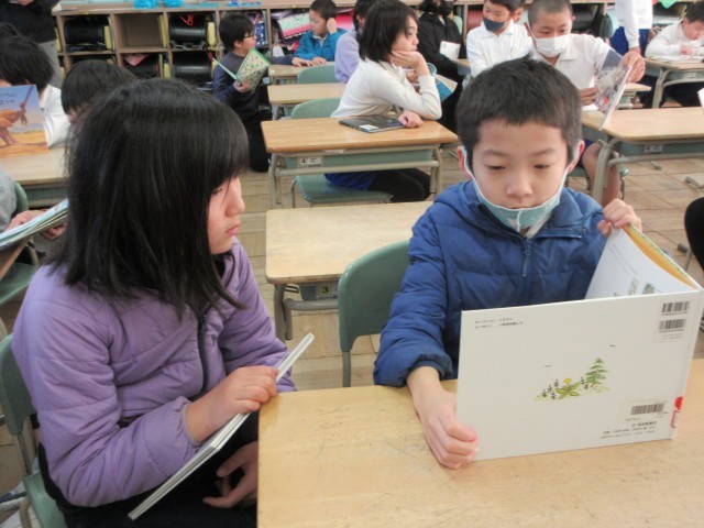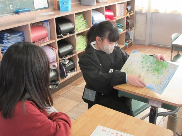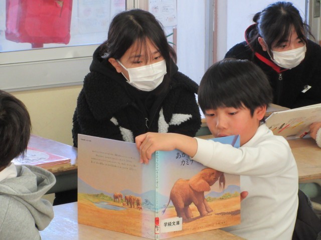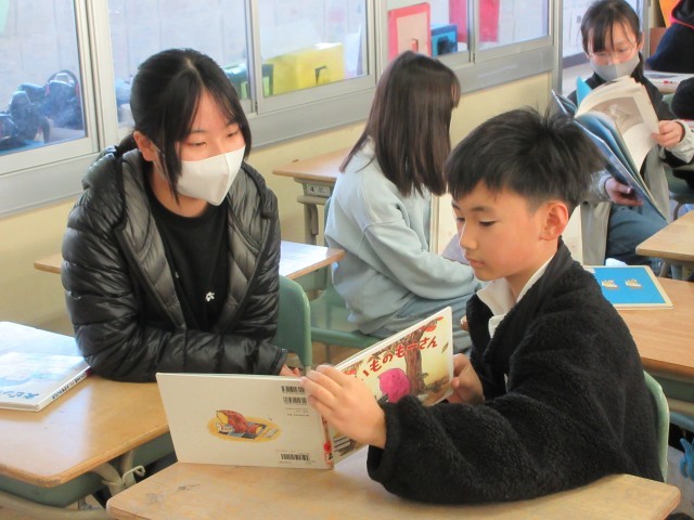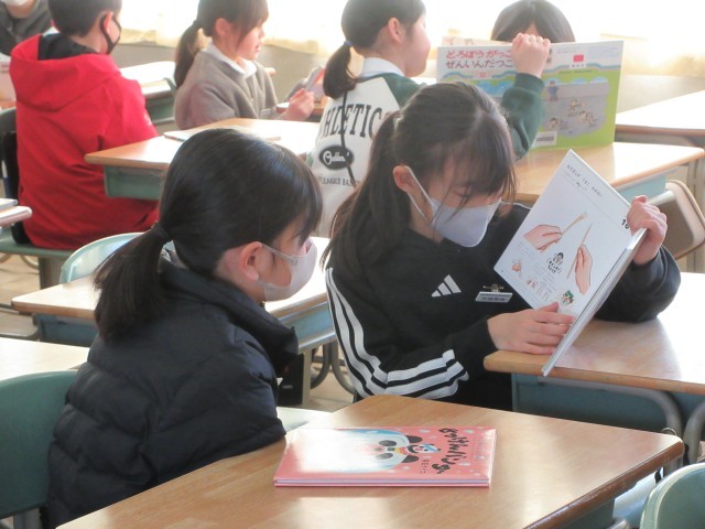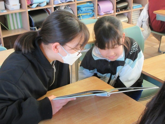 5年生とペアリーディングを行いました。読み聞かせで学んだことを生かし、どうしたら話の内容が伝わるのか、相手に本が見えるようにするにはどのように持つとよいのかなど考えながら行うことができました。楽しんで本を読み合う様子が見られ、笑顔あふれる時間となりました。