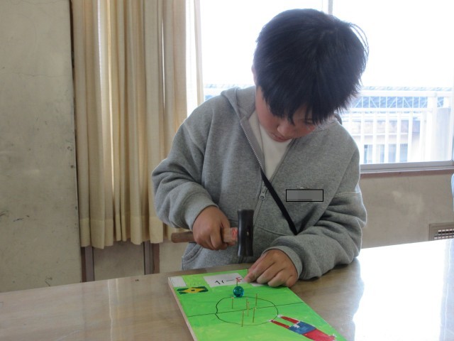 初めてのくぎ打ちに苦戦する場面もありましたが、だんだん打つのも上手になってきました。楽しく遊べるゲームにするために、実際にビー玉を転がして様子を見たり、くぎやゴムを加えたり、工夫しながら取り組む姿が見られました。完成が楽しみです。