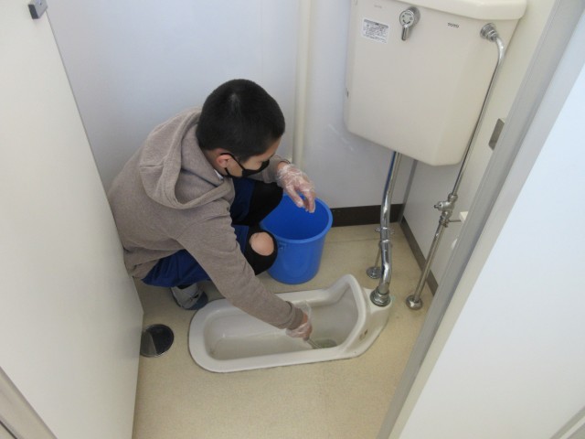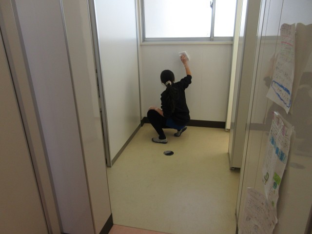 今池小学校のために何ができるかを卒業プロジェクトリーダーを中心に考え、学校中のトイレ掃除をすることになりました。一人2~4個室と通路。よごれがこびりついているトイレもあり、はじめは途方に暮れていたチームも見られましたが、みんなが気持ちよく使えるように、がんばってきれいにしました。1枚目の写真がbefore、10枚目がafterです。水分とシューズの裏に付いた汚れが混ざると床が黒ずみやすいです。手を洗った後はハンカチで拭き、トイレで失敗したときはすぐに拭きとるか先生に伝えてくださいね。