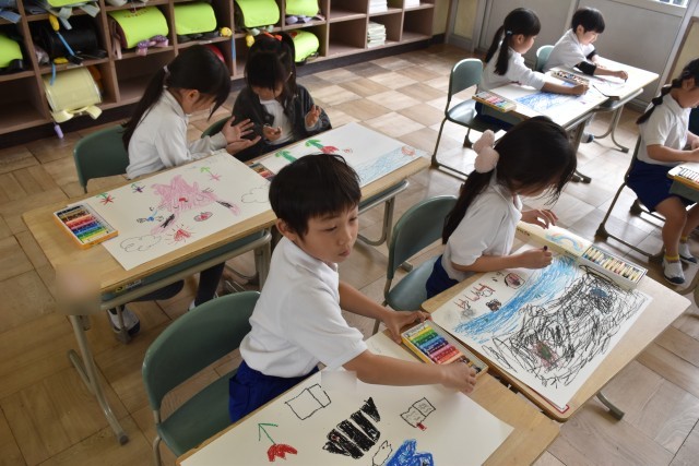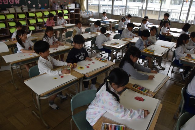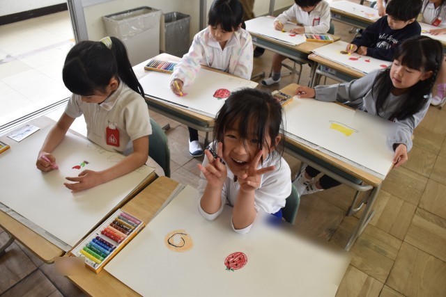 ぴかぴかのクレヨンを使って、好きなものを画用紙いっぱいに描いています。先生の話をよく聞いて、何を描こうかなとじっくり考えている子もいました。いちご、うさぎ、大縄、車・・・。友達に好きなものをたくさん知ってもらいたいですね。