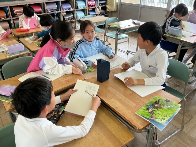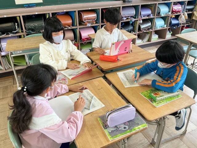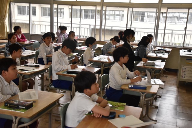 国語の授業で詩「水平線」の学習をしました。水平線とは何かを説明したり、第3連までで構成されていることを確認しました。「近くで見ると波で揺れている海も、遠くから見ると一直線の水平線に見える」など、詩から水平線の様々な様子を読み取りました。