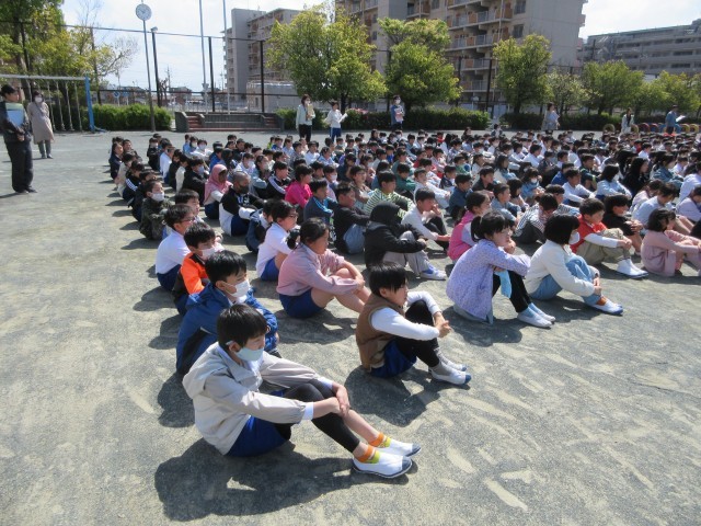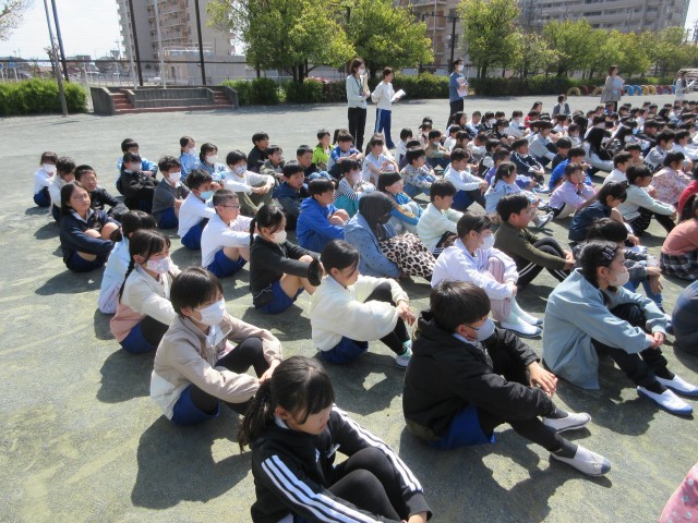 避難訓練を行いました。教室からの避難経路を確認し、いざという時に備え、みんな真剣に訓練を行うことができました。校庭に避難してからも、校長先生の話を真剣に聞くことができました。