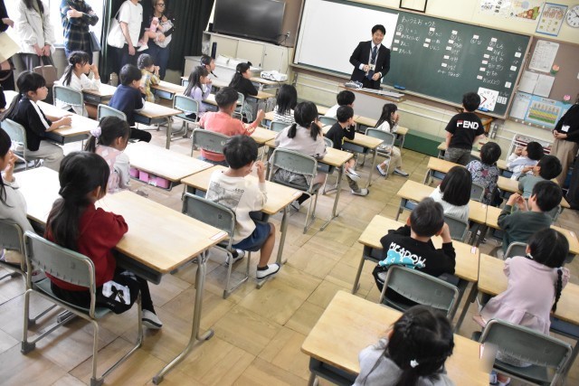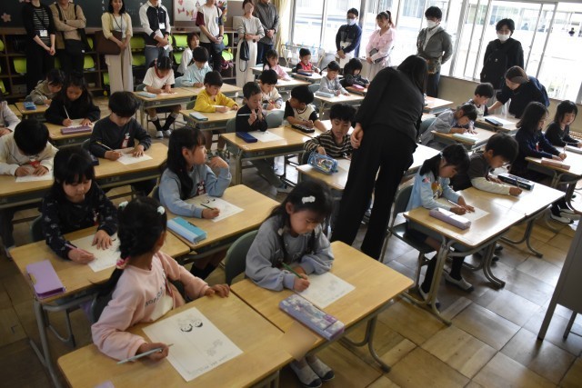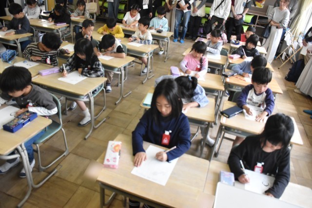 授業参観で国語の学習をしました。あいうえおの歌を歌ったり、自分の名前をひらがなで書いたり、あ、い、う、え、おがつかわれている言葉を発表したりしました。大きな字で力強く書かれた文字から、1年生のみなさんのやる気が伝わってきました。ご参観ありがとうございました。