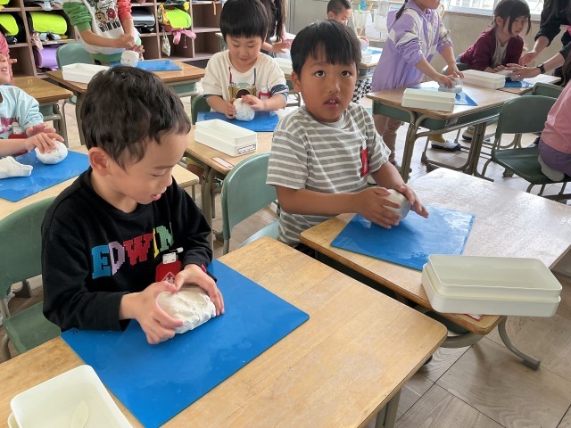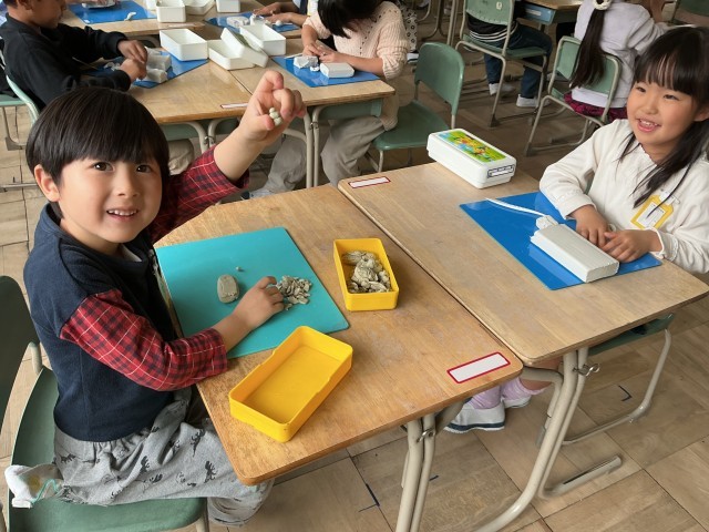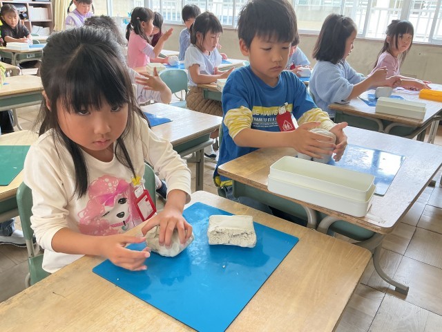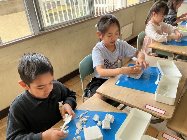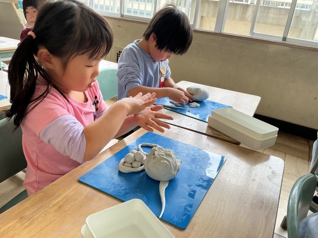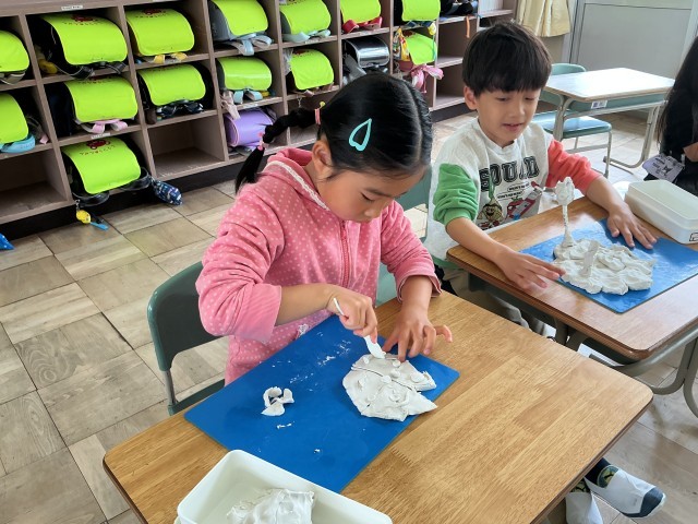 図工でねんどに触れました。どんなものを作ろうかと目をキラキラさせて、ねんどに向き合う姿が見られました。「先生みてみて」と作品を自慢げに見せてくれる児童もいました。