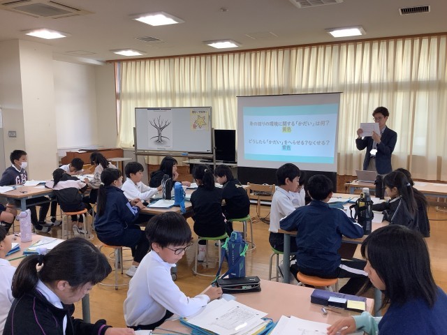 総合的な学習の時間に、地元の企業の方を講師に迎え、環境についてお話していただきました。実際に企業で行われている環境によい取り組みについての話を聞き、エコライフチェックシートを用いて自分の行動を振り返りました。実際に振り返ってみると自分たちにも環境によい取り組みができることを知りました。これからも、もっと環境をよくしたいという気持ちになりました。環境のために私たちに生活について改めて考える機会になりました。