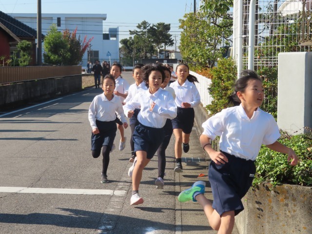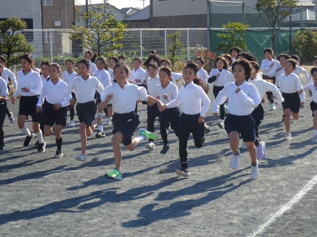マラソン大会を実施し、秋空の下、女子41名、男子43名が走りました。去年のタイムや試走のタイムより1秒でも速く走ろうと、つらさを乗り越えて、一生懸命がんばりました。走り終わると、どの子も満足そうな顔をしていました。