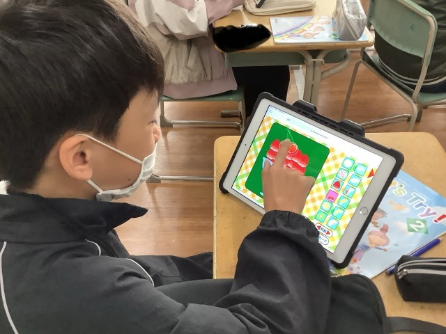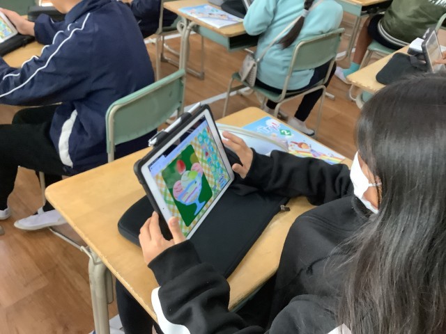 外国語活動の授業では、オリジナルパフェ作りをしました。パフェに入れる果物やアイスクリームの中身を英語で表現したり、友達のパフェに入っているものを聞き合ったりしました。お気に入りの果物を多く入れる子や多くの種類の果物を入れる子など、どれも美味しそうでした。楽しみながら活動することができました。
