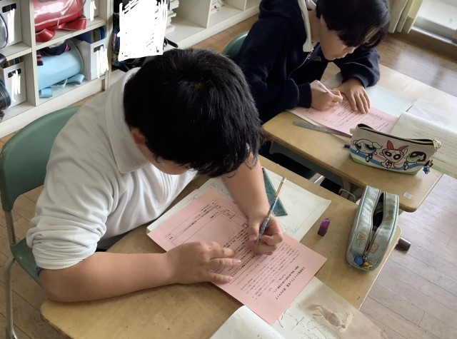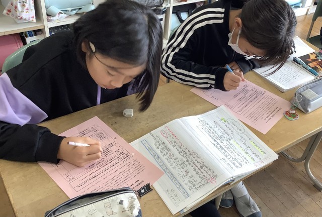 国語でマイプラン学習をしています。『ごんぎつね』を読んだ感想から、自分が追究したい課題を見つけ、計画を立てました。教科書の文章を何度も繰り返し読みながら、表現の意味を考えました。