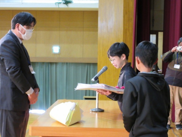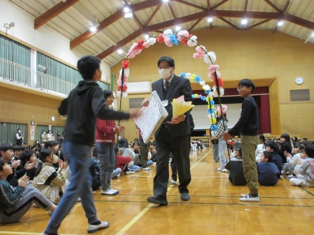 6年生が校長先生へ感謝を伝えたいという思いから、6年生児童が企画・準備・運営をした臨時児童集会が行われました。この児童集会では、サプライズとして、本年度末で役職定年を迎える校長先生に感謝の思いと「卒業証書」を渡しました。全校が協力して行い、感動的な会になりました。校長先生への歌声プレゼントも、心のこもったすばらしい歌声でした。