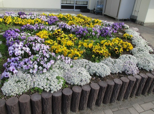 また、玄関横の花壇もパンジーやアリッサムの花々が満開です。登校した子どもたちを、美しい花々が出迎えてくれています。