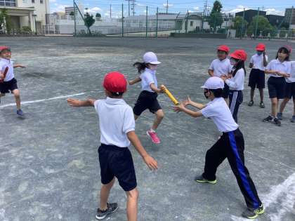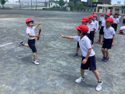 2年生はこれまで鉄棒やマット運動に取り組んできましたが、今日は小学校に入って初めてのリレーをしました。赤チームと白チームに分かれて、デッドヒートを繰り広げました。どちらのチームもみんなで応援をして、楽しく活動することができました。