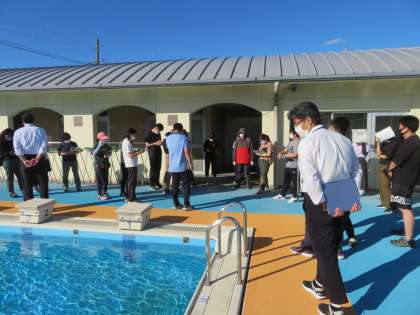来週に迫ったプール開きに備えて、職員でプールの機械の操作やプールに入る前の準備などを確認しました。