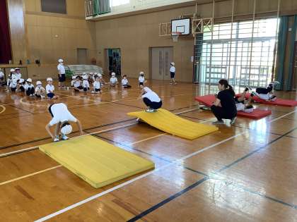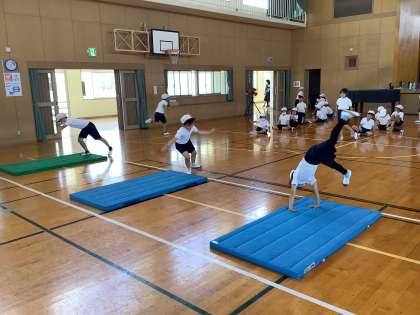 体育の時間に、マット運動をしました。子どもたちは、前転や後転の練習を頑張っています。側転にも挑戦している子もいます。かっこよく技を決めることができると、笑顔いっぱいにポーズを決めていました。