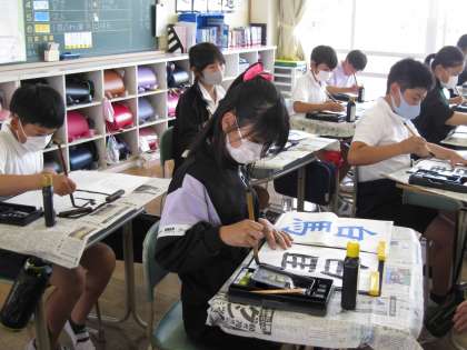 1組は書写の授業で「白馬」の字を書きました。字のバランスを考えながら、集中して書いていました。