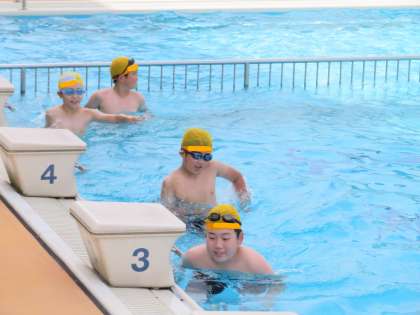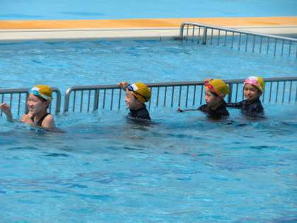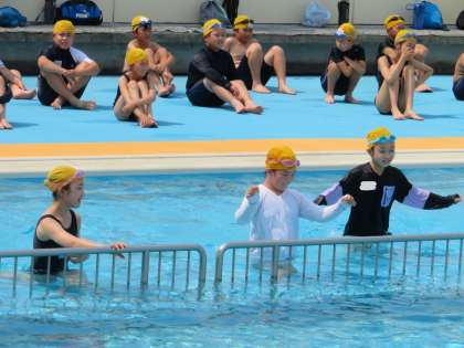 5年生は浅いプールで体をならしたあと、深いプールにも入りました。深くてびっくりという子もいました。