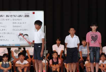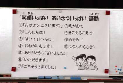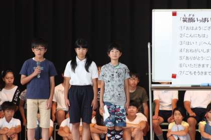 今年の三河安城小学校のスローガンは「笑顔いっぱい、あいさついっぱい」です。「おはようございます」や「こんにちは」だけでなく、返事や感謝のことばも含めて、全校であいさつのあふれる学校にしていきたいと思います。
