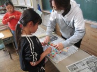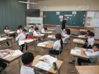 そうじの時間には、1年生の教室に6年生の「おそうじお兄さん」、「おそうじお姉さん」が来てそうじを手伝ってくれます。今日は、はきそうじをする「おそうじお兄さん」のあとをついて、一生懸命はいたり、床を拭いたりして、磨き上げていました。