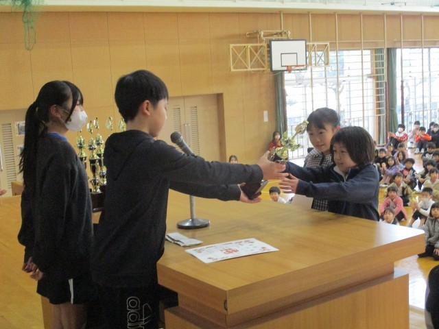 花いっぱいプロジェクトからは、植物に関するクイズが出されました。スポーツ大好きプロジェクトからは、1月の長縄大会で優勝した各学級の表彰を行いました。