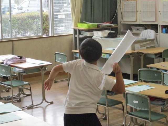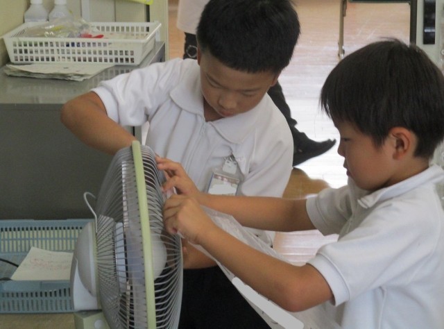 1年生の生活科では、傘袋に空気を入れたロケット作りに取り組んでいます。ロケットを遠くに飛ばそうと形状を考えたり、飛ばし方を工夫して試したりする子、そして、ロケットをカラフルな飾りに彩ろうとしたりする子など、それぞれの課題をもって試行錯誤しながらも楽しく取り組んでいました。