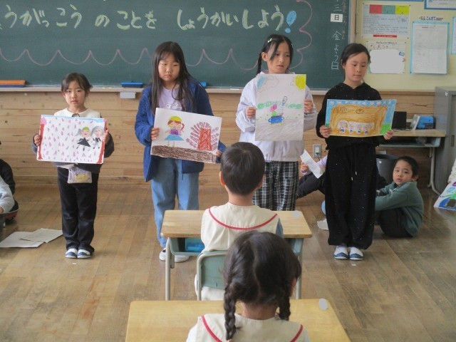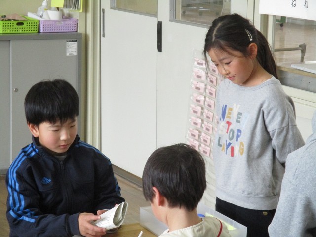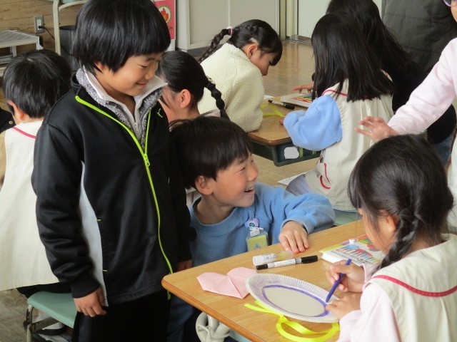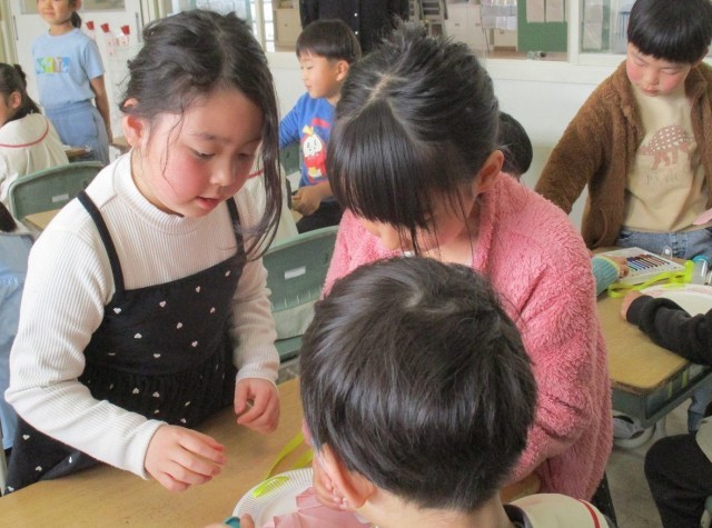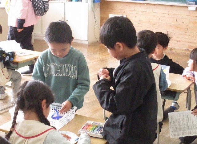 今週、近隣にある保育園の園児たちが1年生の教室を訪問します。そして、来年度には新たに入学する1年生が今の教室を使用します。どちらにも気持ちよく教室に入ってもらおうと、飾りを制作しています。来ていただく人たちのため、子どもたちは心を込めて作っています。