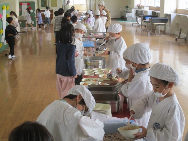 入学して今日が最初の給食です。1年生も、給食当番の人たちで配膳します。先生たちの指示や手伝いを受けながら、自分たちで初めての給食配膳を行いました。とても立派にできました。