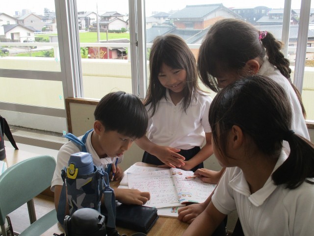 国語「名前を見てちょうだい」の内容について発表する準備をしています。さまざまな表現方法で発表しようと、子どもたちは工夫をしながら楽しく準備をしています。