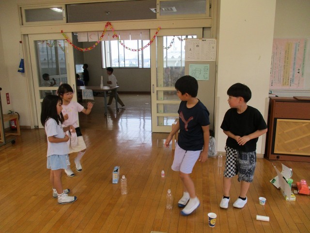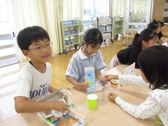 家庭にあるいろいろな箱や紙コップ、トイレットペーパーの芯などを使って、おもちゃ作りをしています。子どもたちは試行錯誤しながら、より楽しめるようなおもちゃを開発中です。