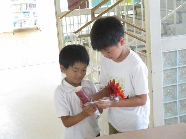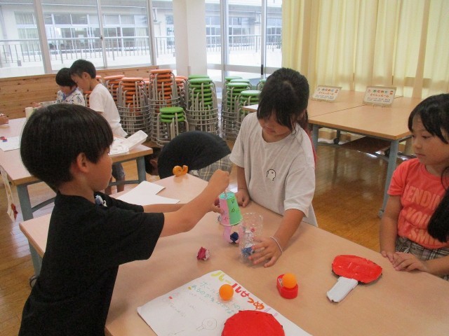 図画工作では、紙けん玉を製作しています。前回製作したものにさらに手を加え、個性あふれるけん玉を作りました。互いにアドバイスしながら、それぞれの工夫も見られました。