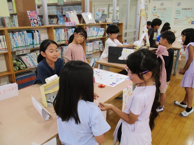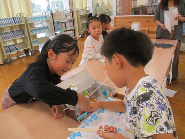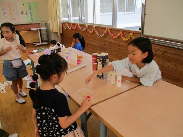 1年生をお客様としてお招きし、2年生がお店屋さんとして「おもちゃまつり」を開催しました。それぞれが工夫して製作したおもちゃを手に取って楽しそうに遊ぶ1年生の姿を見て、子どもたちも大満足でした。